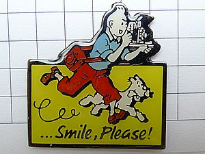 写真はピンズマルシェのピンバッジ、写真カメラマンのタンタンとスノウィ。