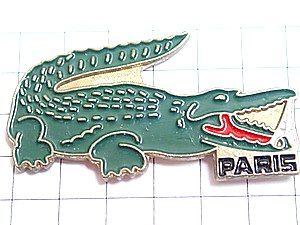 写真はピンズマルシェのピンバッジ、エッフェル塔をくわえるラコステのワニ。
