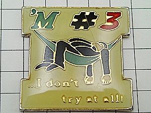 写真はピンズマルシェのピンバッジ、ハンモックの疲れた男。