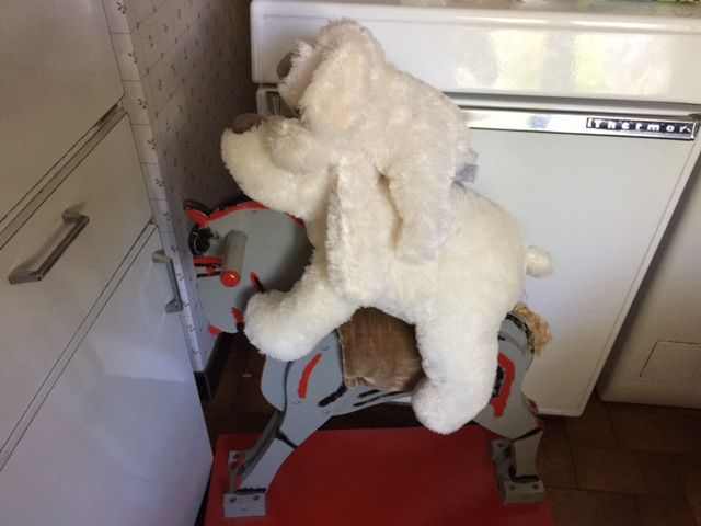 わんわんの乗っている木馬は、子供の頃のディディエのためにパピが作ったもので、現在はルイの所有する馬となりました。食卓の自分の椅子のそばに横付けて、食事の合間にちょっと乗ってみたり。