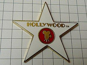 写真はピンズマルシェのピンバッジ、ハリウッドの映画カメラ。